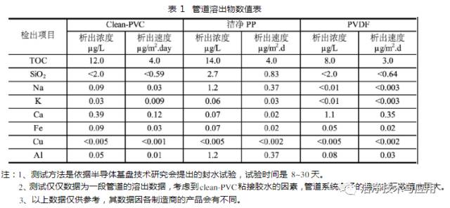 選擇管材的依據(jù)主要是管道的溶出物(見表1)及內(nèi)表面光潔度。主要應(yīng)用的管道有Clean-PVC管、潔凈PP管、PVDF管幾種。Clean-PVC管采用耐沖擊硬質(zhì)聚氯乙烯制造,其比普通PVC管含有較少的添加劑。從而減小了管道內(nèi)壁的粗糙度(Clean-PVC管的表面粗糙度小于0.37 μm,而普通PVC管的表面粗糙度在1.0 μm)以及污染物的析出。制造商主要有“積水國際貿(mào)易有限公司(SEKISUI)”、“日本旭有機(jī)材株式會(huì)社(ASAHI AV)”。潔凈PP管材質(zhì)為(β)-PP-H均聚型聚丙烯,具有非常均一、致密的結(jié)構(gòu)和出眾的抗沖擊強(qiáng)度。其高結(jié)晶度確保了極好的耐化學(xué)品性能,二氧化鈦色素的使用進(jìn)一步提高了此特性。其內(nèi)壁粗糙度及污染物的析出性能與Clean-PVC接近。制造商主要有喬治.費(fèi)歇爾管路系統(tǒng)有限公司(+GF+)。PVDF管材質(zhì)為聚偏二氟乙烯,是一種高結(jié)晶度,純水設(shè)備高性能熱塑性塑料,可用溫度/壓力范圍廣。其主要特性是力學(xué)強(qiáng)度高、韌性好、具有優(yōu)異的耐磨性、熱穩(wěn)定性和介電性,其純度高,能熔融成型,對于大多數(shù)化學(xué)品和溶劑都具有很好的耐腐蝕性、抗紫外線和核輻射性能好、耐候性好、耐生物菌類的作用、氣體和液體阻隔性好、阻燃性好、發(fā)煙量少等優(yōu)點(diǎn)。聚偏二氟乙烯是一種純凈的材料,它不含任何添加劑,且其表面光滑,粗糙度小于0.2μm。制造商主要有喬治?費(fèi)歇爾管路系統(tǒng)有限公司(+GF+)、奧地利AGRU公司。