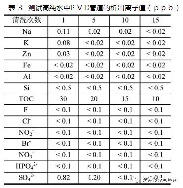 如表2所示,8英寸半導(dǎo)體對純水水質(zhì)指標(biāo)的要求相當(dāng)嚴(yán)格,Clean-PVC及潔凈PP已不能滿足其要求,而PVDF管道的溶出物及管道內(nèi)壁光潔度都遠(yuǎn)強(qiáng)于Clean-PVC及潔凈PP,故而只能選擇PVDF管道。在國內(nèi)的半導(dǎo)體生產(chǎn)中也有8英寸采用Clean-PVC管道的成功案例,但經(jīng)過實(shí)測分析后發(fā)現(xiàn),這類生產(chǎn)廠的產(chǎn)品都是從6英寸升級至8英寸的,也就是在6英寸純水管道系統(tǒng)運(yùn)行若干年后升級為8英寸的,而Clean-PVC管路系統(tǒng)經(jīng)過長時(shí)間運(yùn)行后,其溶出的離子呈逐步減少的趨勢。以某電子廠為例,一期廠房純水系統(tǒng)未設(shè)置專門的除TOC紫外線燈,僅依靠制備過程中對TOC的去除,在運(yùn)行了若干年后,其回水管道TOC可以達(dá)到15ppm,而二期新建的純水系統(tǒng),設(shè)置了專用的除TOC紫外線燈,在系統(tǒng)開始運(yùn)行階段的站房出口TOC,也只有50 ppm。正是由于這種特性,所以純水系統(tǒng)在投產(chǎn)前需經(jīng)過相當(dāng)長時(shí)間的沖洗運(yùn)行。所以在從6英寸升級到8英寸的生產(chǎn)中,經(jīng)過若干年沖洗的Clean-PVC管道也是有可能達(dá)到使用要求的。而PVDF管道可以在短時(shí)間內(nèi)沖洗到較低的指標(biāo),如表3所示。為了節(jié)省初投資,純水回水管道可以采用Clean-PVC或者潔凈PP管代替PVDF,由于純水回水需經(jīng)過拋光系統(tǒng)的再次處理,所以即使回水中有較多的溶出物也不影響供水的水質(zhì),只是會(huì)影響拋光系統(tǒng)的維護(hù)費(fèi)用,但長時(shí)間運(yùn)行后維護(hù)費(fèi)用的差別會(huì)逐步減小。